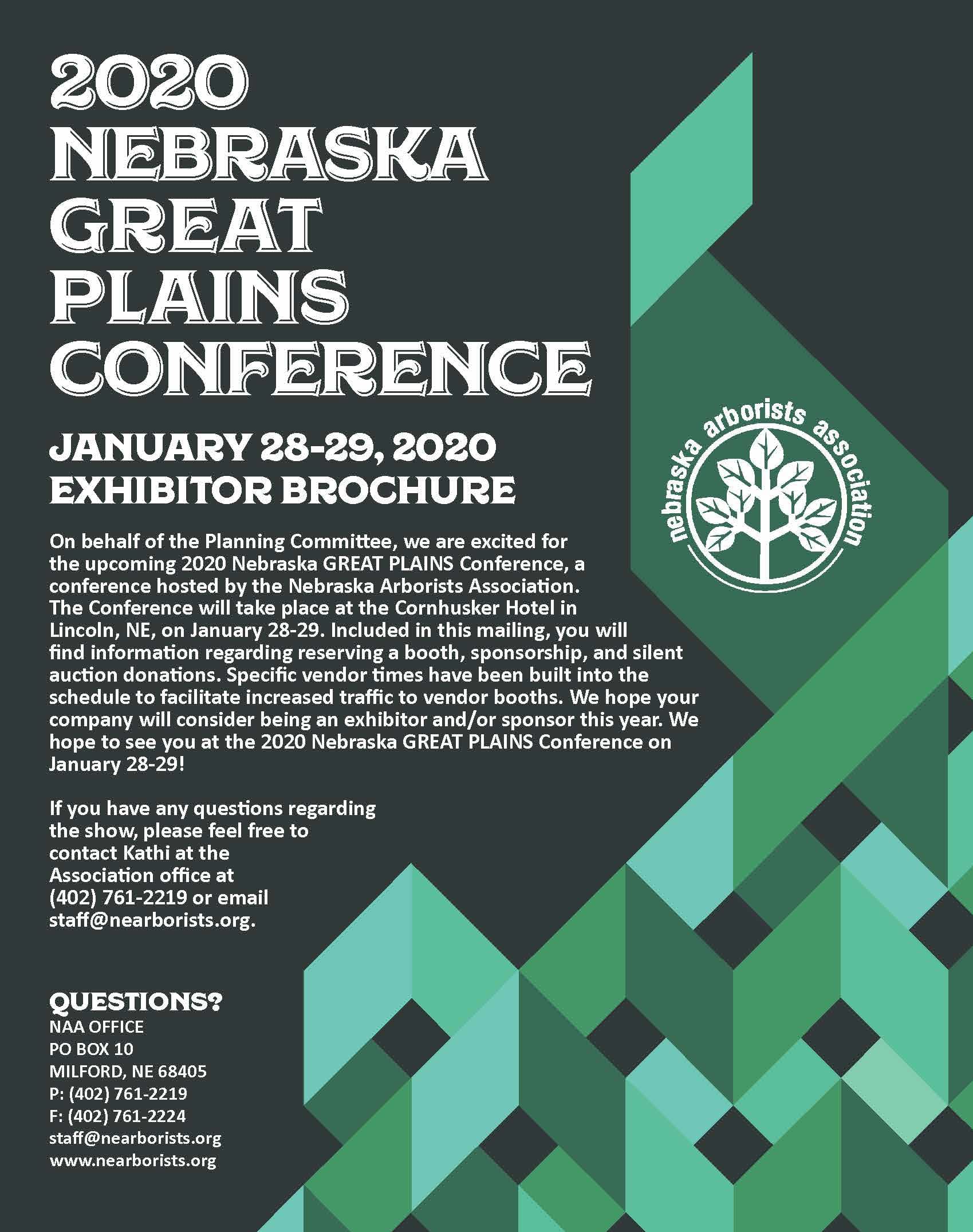 On behalf of the Planning Committee, we are excited for the upcoming 2020 Nebraska GREAT PLAINS Conference, a conference hosted by the Nebraska Arborists Association. The Conference will take place at the Cornhusker Hotel in Lincoln, NE, on January 28-29. Included in this mailing, you will find information regarding reserving a booth, sponsorship, and silent auction donations. Specific vendor times have been built into the schedule to facilitate increased traffic to vendor booths. We hope your company will consider being an exhibitor and/or sponsor this year. We hope to see you at the 2020 Nebraska GREAT PLAINS Conference on January 28-29!