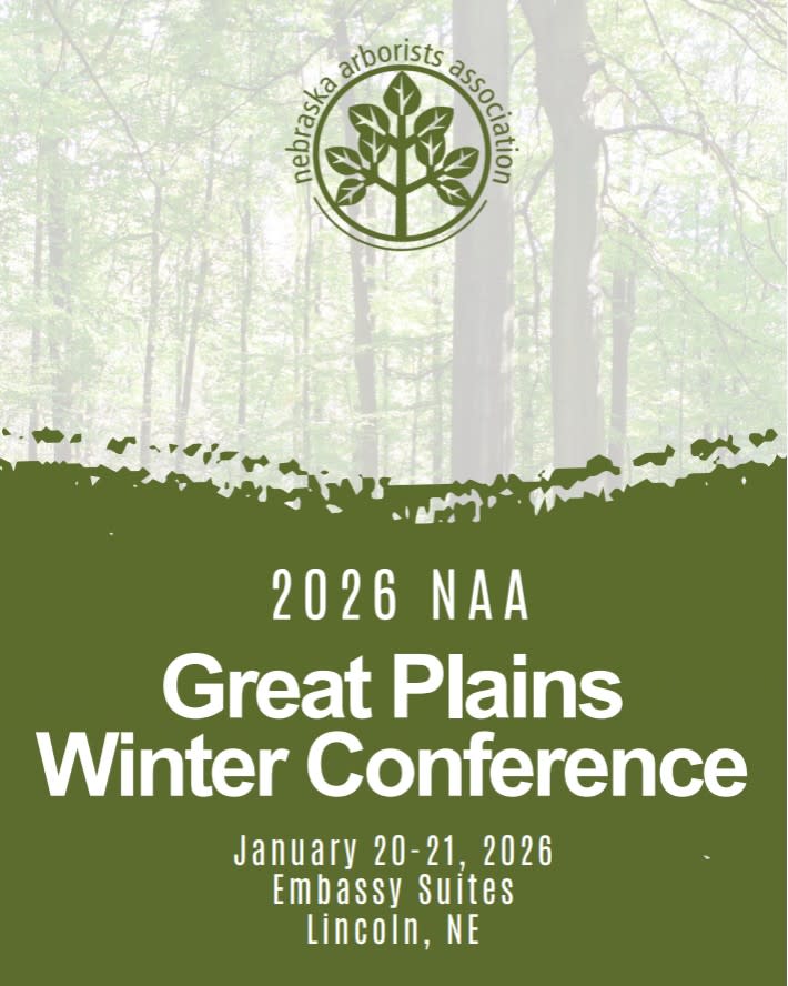 On behalf of the Planning Committee, we are excited about the upcoming 2026 Nebraska GREAT PLAINS Conference, a conference hosted by the Nebraska Arborists Association. The Conference will take place at the Embassy Suites Hotel in Lincoln, NE, on January 20-21, 2026. For sleeping room reservations, please call (402) 474-1111. If you have any questions regarding the show, please feel free to contact the Association office at (402) 761-2219 or email staff@nearborists.org