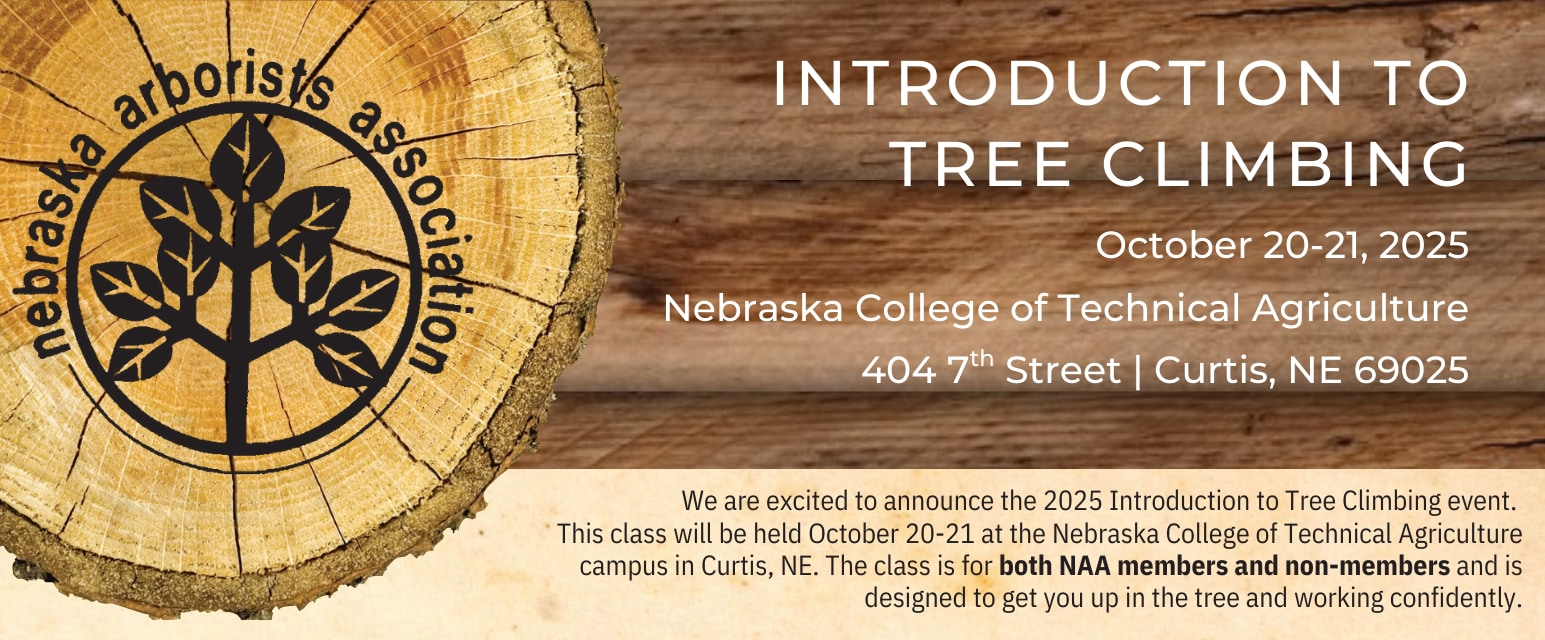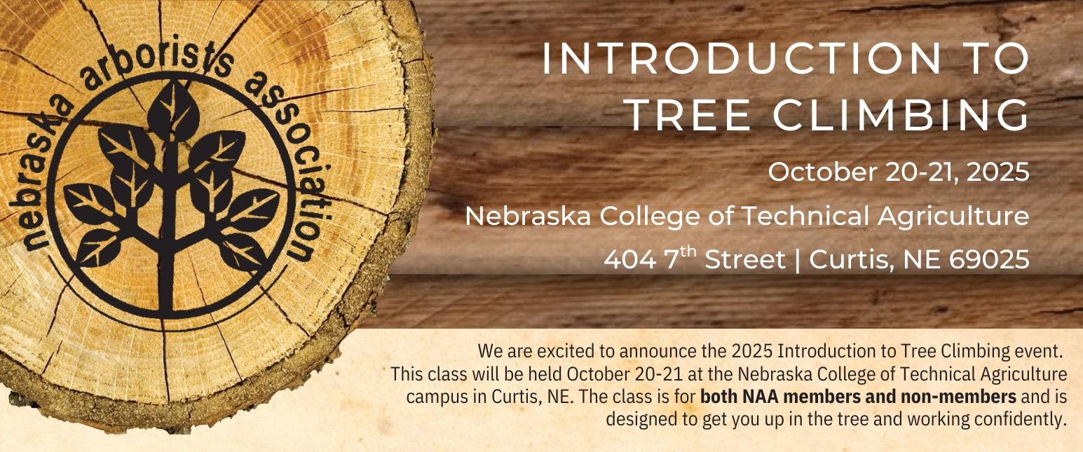 We are excited to announce the 2025 Intro to Tree Climbing Event located on the NCTA campus in Curtis, NE, October 20th – 21st, 2025. This class is open to NAA and non–NAA members and is designed to get you up in the tree and working confidently.